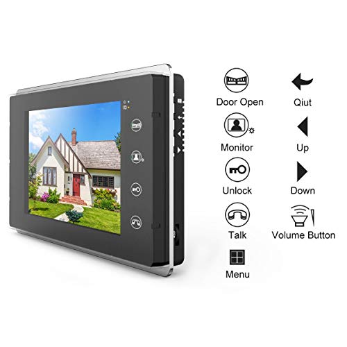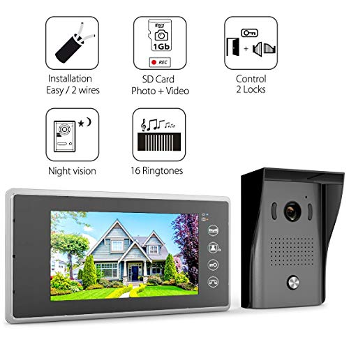 1byone Colorful Video Doorbell Provides You Security Through Vision Surface wall mounted for easy installation, 7-inch color monitor ensures you see and speak with all visitors freely! Need to see the photos of recent missing visitors? No worries! 1byone Video Door phone automatically takes and stores of photo of each visitor when pressing the doorbells ‘ Call button. All photos are automatically stored in the monitors internal memory. Videos can also be recorded and saved using an inserted SD card. Double Unlock System Control up to 2 electric gate and door locks directly from the color monitor for even further security and convenience, so that you can open the gate and door more conveniently and securely from inside your house. IR (infrared) LED for Night Version The LED on the outdoor doorbell will light on automatically so that you can see clearly of visitors even in the darkness of evening. Durable Construction The Outdoor doorbell is constructed with a full aluminum front panel for protection from vandalism, while waterproofing protects from the rain or snow. Product Specification: Indoor Monitors Display size: 7″ color screen Adapter input voltage: 110~240V/50~60HzContinuous talk-time: 120s± 10%Continuous monitor-time: 40s± 10%Adapter output: DC15V 1200mAPower consumption: standby<0. 5W, working<10WWorking temperature: 14º F~104º F (-10º C~40º C)Size (WxHxD): 9. 25″x5. 04″x0. 98″br>Outdoor Video Doorbell Power: DC15V 1200mA from indoor monitor Night Vision: 6 LED’s Waterproof rating: IP44Camera resolution: CMOS 600TV line Camera visual angle: 120° wide-angle Size (WxHxD): 4. 29″x6. 34″x2. 42″Packing Includes: 2x Indoor Video Monitors2x Power Adapters1x Outdoor Video Doorbell1x Rain Cover for Video Doorbell9 x Screws and Plastic Plugs2x Mounting Brackets for Monitors1x Instruction Manual2x 49ft Cables1x Hex Wrench