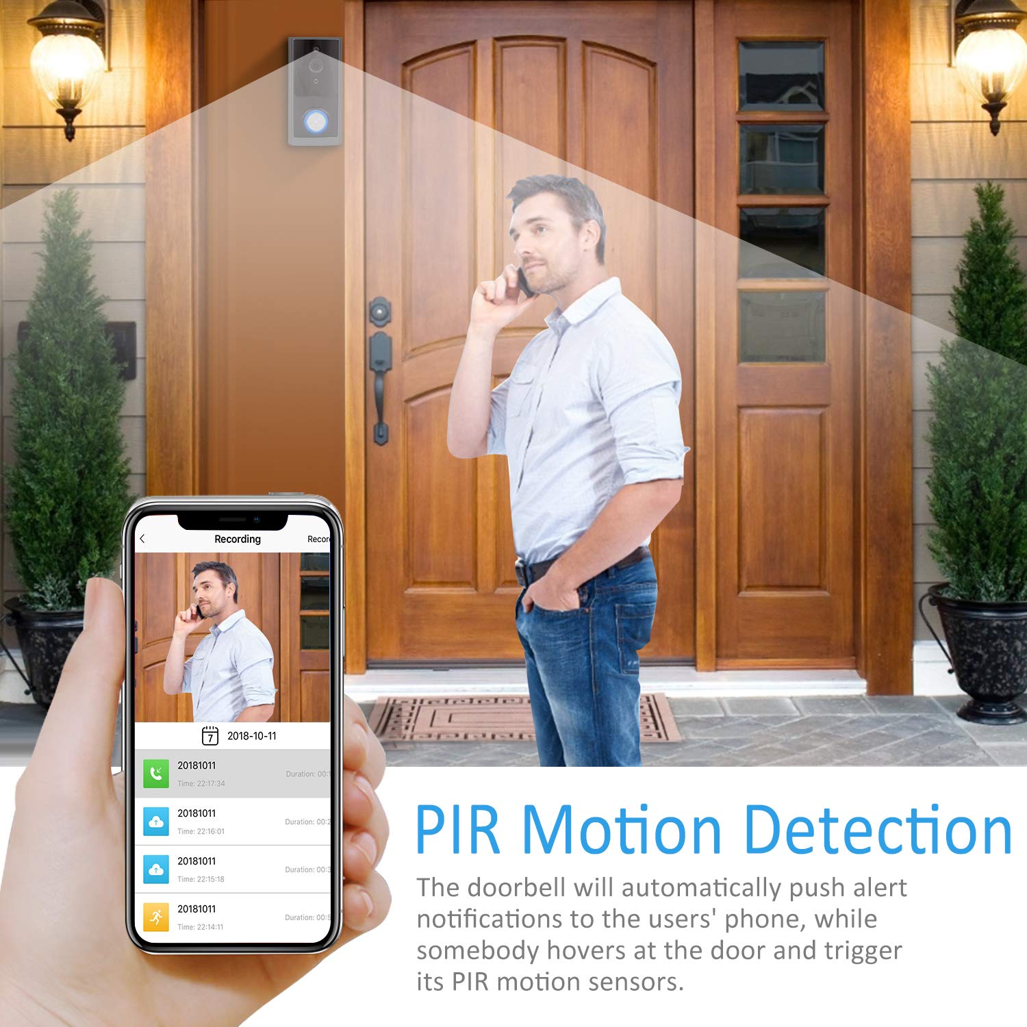 ►True Wire-Free Video Doorbell with Chime – See, Hear and Speak to visitors in your doorfront. Get instant alerts when visitors press your Doorbell or trigger the built-in PIR Motion sensors. Equipped with IR sensor and enhanced HiSilicon AI CPU inside, smart door ring can see up to 36ft night vision and 720P full HD Camera Doorbell with 166°Wide Angle Lens, home surveillance security doorbell and chime captures sharp and bright HD videos.